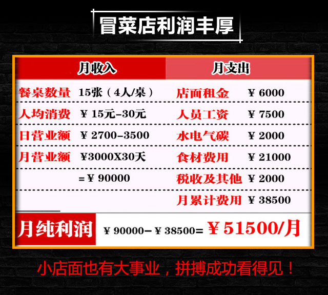 开业前公司总部结合桐柏县消费特点以及人群消费能力分析,制定了开业优惠政策,朋友圈一经推广更是吸引力十足。但是天工不作美,开业的第一天就下暴雨,当时总部的督导心里都咯噔咯噔的,怕第一天就没人气,但是一到饭点,门庭若市,第一天就卖了2200多营业额,第二天又卖了3400多,第三天居然冲到了4908元,毕竟这个店才60多平方,一年的房租也才5万,每天纯利润高达2000多。王先生看着这蒸蒸日上的事业,心里了就开了花,并且开始盘算着要开第二家、第三家川西冒菜店了。 50多岁的王先生都没有放弃奋斗,难道你就要懈怠了吗?别人用行动和实践证明了加盟川西冒菜的正确选择,川西冒菜专业指导和真心服务,不是每一家冒菜都可以叫川西冒菜的。幸福是靠勇气和努力奋斗出来,奋斗需要选择正确的方向。成功永远不晚,勇敢踏出你的第一步,冒菜加盟就选择川西冒菜,帮助你成就财富和自信的未来! |